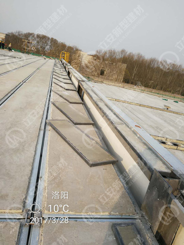 六、将板材全部放置在屋顶几个独立单元吊起后,开始调整缝隙,调整缝隙平整,尽量使缝隙宽度均匀,一般以2-3cm宽为宜。